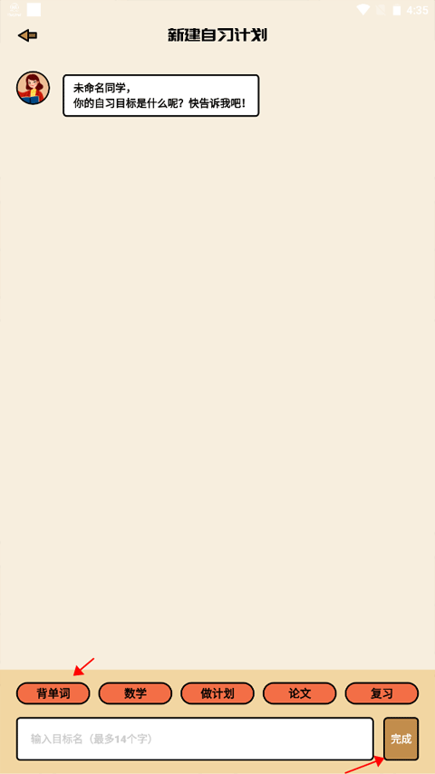 3、在输入框里填写你打算自习的内容,像背单词、做数学题、写论文之类的,接着点击完成按钮发送即可。