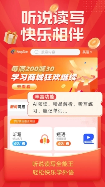KeepSee是款非常便利好用的英语学习平台,为各位用户提供系统化教学,还可以进行口语训练,平台提供大量的教学资源,可以观看视频学习以及答题训练教学等,为不同学生定制专属教学计划,还提供复习功能以及训练教学等,基础学习资料以及进阶学习资料都有。