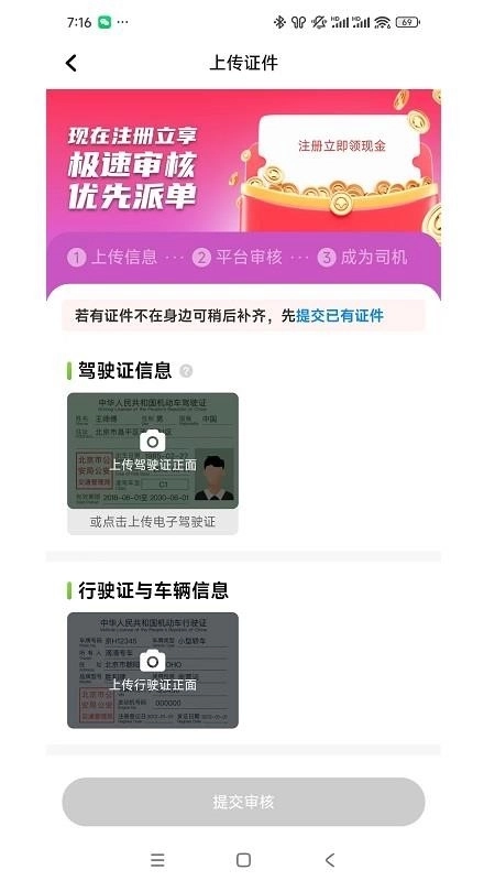 1、在线即可编辑信息、上传证件完成司机认证,同时可自主选择带车或租车的方式加入。