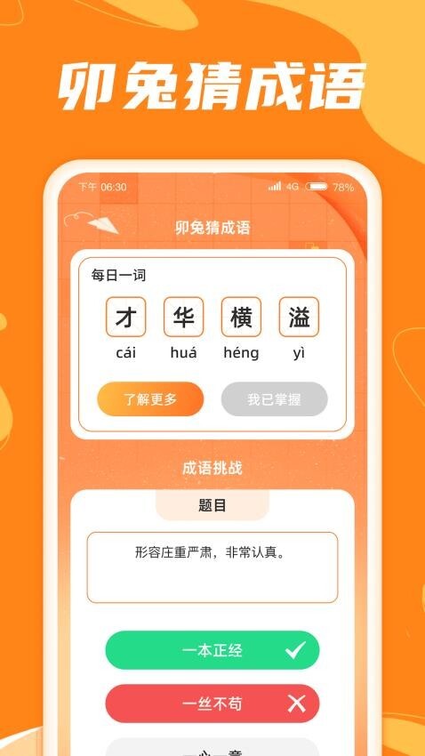 卯兔猜成语是一款面向移动设备的成语猜谜类应用,由致力于中华文化传承的卯兔团队打造。该应用借助趣味十足且富有创意的形式,助力用户学习与挑战成语相关知识,使学习过程告别单调乏味。