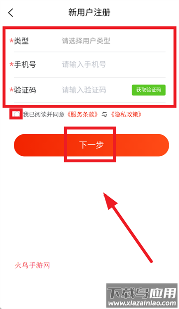在新用户注册页面,先选择对应的用户类型,接着输入手机号码和验证码,然后勾选“我已阅读并同意《服务条款》与《隐私政策》”,最后点击“下一步”按钮,就能完成注册流程啦。