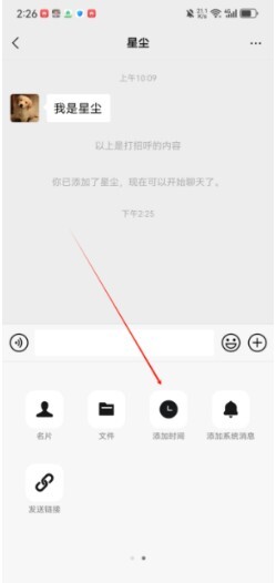 在聊天界面,点击输入框旁的“+”图标,横向滑动功能菜单,找到并点击“添加时间”选项,即可在聊天内容中插入当前时间。