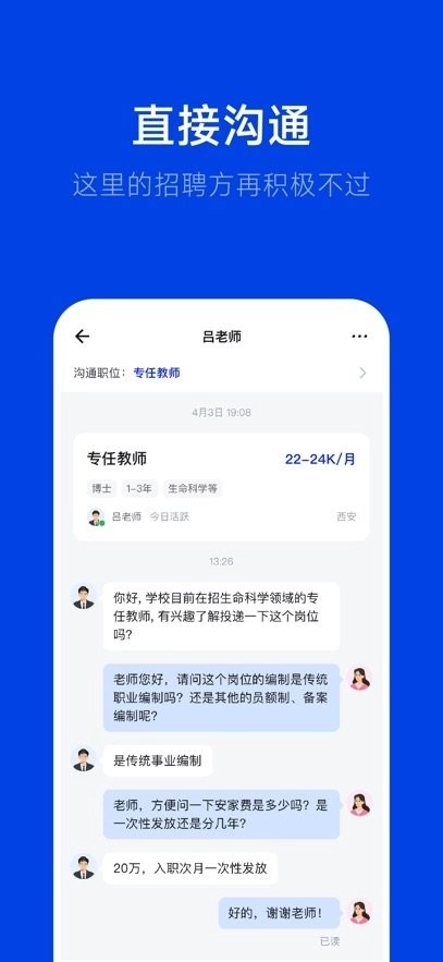 【在线沟通】在线沟通无需等待,随时随地都能和招聘方畅快交流,第一时间就能收到反馈。