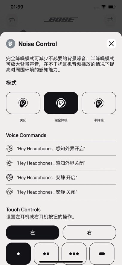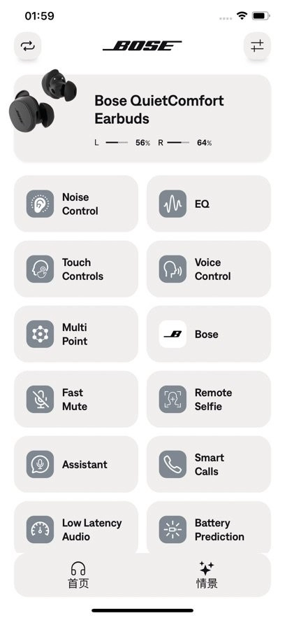 你可以通过 Bose QCE 应用程序实现更多个性化设置。借助五频段可调均衡器,你能随时调整声音,灵活掌控低音、中音和高音的水平。还能在 ANC 模式间切换,从静音模式到感知模式,再到关闭状态都可自由选择。此外,通过该应用程序,你可以查看电池电量、自定义快捷操作以及管理已连接的设备。