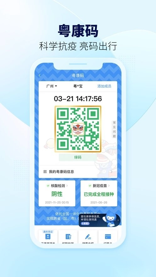 【粤康码】为群众提供健康码状态查询、核酸检测记录查询、新冠疫苗接种记录查询等服务,还创新融入吉祥南狮元素,让你倍感安心。