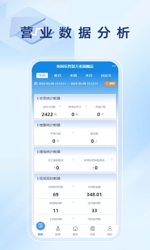 休闲乐营运大师是一款专门面向娱乐休闲场所打造的数字化营运管理工具,能为用户提供房态管理、业绩统计、人员排班、资料报表等实用功能。它把排单、预约、进房、消费记录、绩效统计等环节进行一体化整合,适用于多种经营业态,支持手机端操作,实现数据实时同步,可助力场所构建稳定高效的日常营运流程。感兴趣的朋友不妨来本站体验一番!