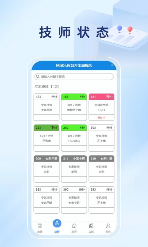 1、技师信息:能够查询技师的服务状态和上钟安排,有利于开展工作调度与管理工作。
