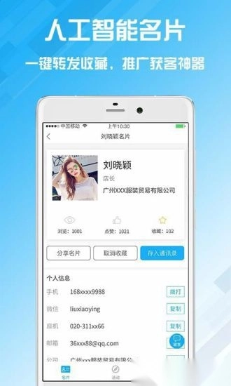 【电子名片】支持一键转发与收藏,助力名片在朋友圈实现裂变式传播获客,让获客更轻松。