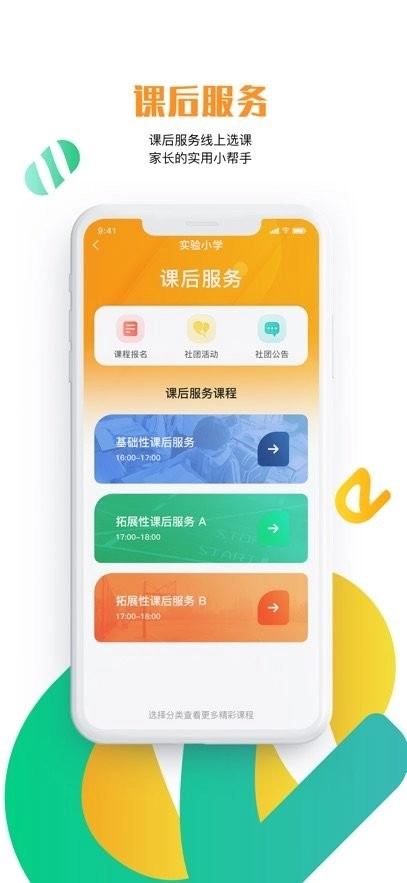 为积极响应国家“双减政策”的全面推进以及地方教育部门的相关号召,我们在应用内特别设置了课后服务课程的线上报课、请假、账单查询等一站式便捷服务功能。家长能够依据学生的不同兴趣爱好,筛选并查看孩子感兴趣的校内社团课程,进而完成线上报名操作。此举旨在丰富学生的课余生活,助力孩子素质教育的培养与发展。