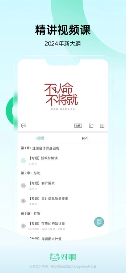 2024年会计职称考试大纲配套的全新视频课程现已上线,课程讲解逻辑清晰、条理分明,严格按照大纲章节规划内容,单课时时长适中。同时支持离线下载、多清晰度切换、投屏观看、后台续播以及夜间模式等实用功能。