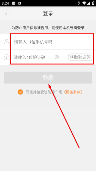 3、进入登录页面后,首先填写11位手机号码,接着点击“获取验证码”按钮,把收到的4位验证码输入到对应的输入框中,之后勾选服务条款,此时登录按钮就会被激活。