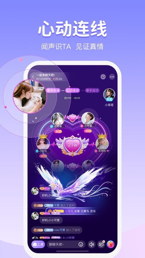 萝莉音、御姐音、青叔音……用声音遇见更多有趣的灵魂;多人连麦,寻觅心动的声线,碰撞出爱的火花。
