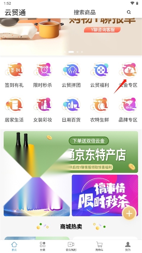 5、每次购物完成后,都会获得云金,云金可用于兑换物品,我们点击云金专区即可。