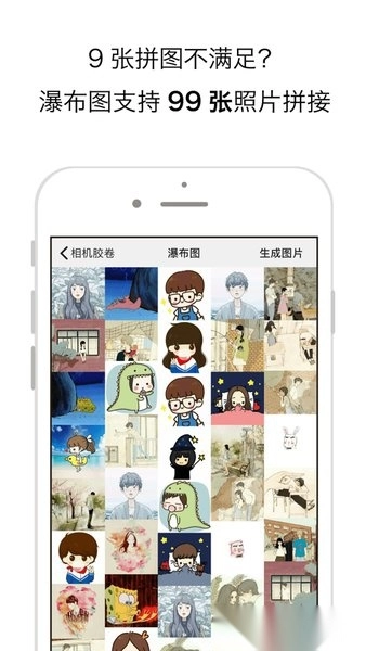 瀑布图。不用再为只能拼9张图而发愁,瀑布图支持拼接99张图片,让你的分享内容更加丰富饱满