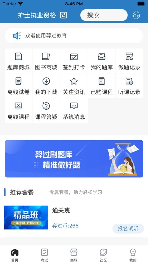 “羿过教育”作为一款移动智能学习软件,覆盖了财经类、建工类、医卫类、职业类、招录类等上百项考试内容。其题库配备了章节练习、试卷练习、做题记录、错题强化、试题收藏、我的笔记、模拟考场、反馈纠错等丰富的学习功能,堪称一站式的考证学习备考平台。