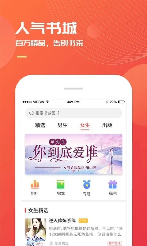 玄幻、都市、言情、武侠、科幻、军事、职场励志,各类题材一应俱全。