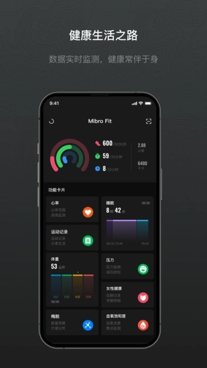 计步、心率、睡眠、体重、梅脱、疲劳度、运动记录等各类健康数据,在首页可实时监控。