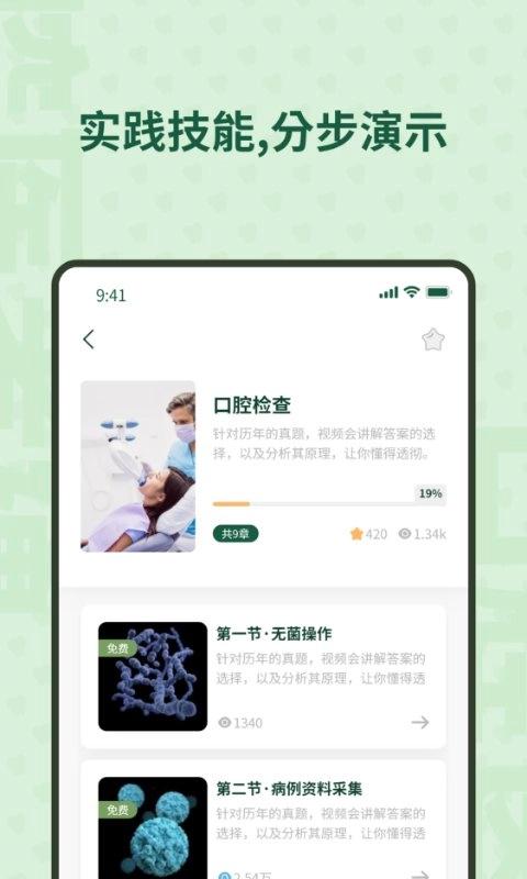 1、【实用技能,分步演示】模拟考核场景,通过真人分步演示各类实用技能,直观呈现操作中的得失要点。