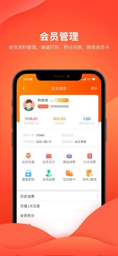 【会员管理】:可完成会员办卡、积分累计、折扣优惠、储值消费、计次服务等功能。