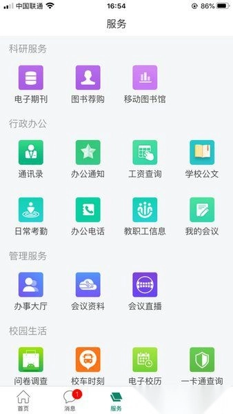 课表、成绩、图书借阅、空教室查询、校历日程、班车查询、办公电话、校园卡查询。