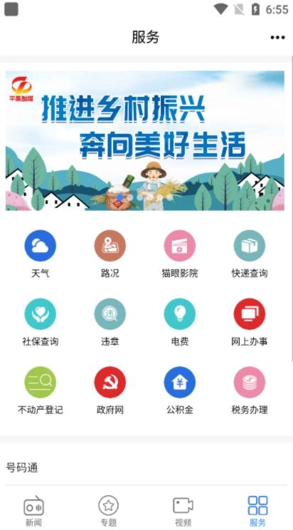 4.点击视频入口,进入后浏览系统提供的视频列表,即可直接观看视频内容。在服务专区内,可查看平台提供的全部服务功能,点击对应功能即可使用。