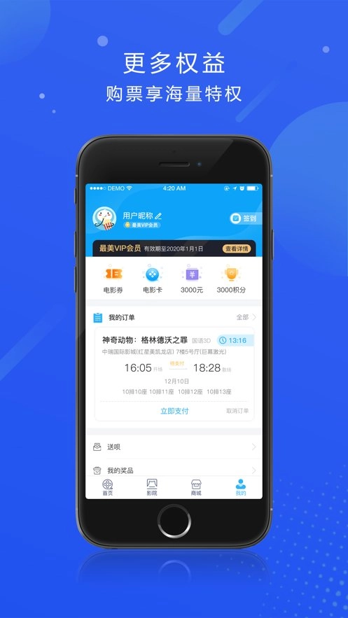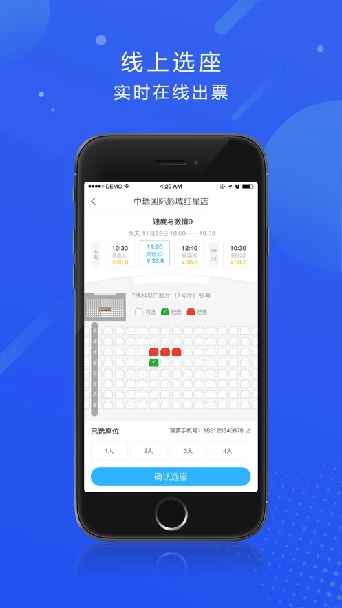 1.自助选座功能,购票流程快捷,与影院前台售票系统保持同步,可实现实时在线选座和快速购票。