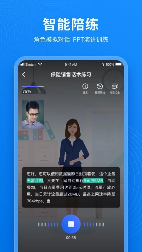 把人工智能和职业技能提升训练深度融合,还原真实的业务场景,让学员借助人机对话的形式开展学习与练习,打破以往枯燥乏味的学习考核模式,利用AI技术给出实时反馈,减少人工评估的重复性劳动和主观因素影响,培训成效清晰可见。