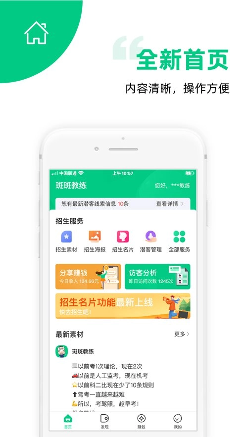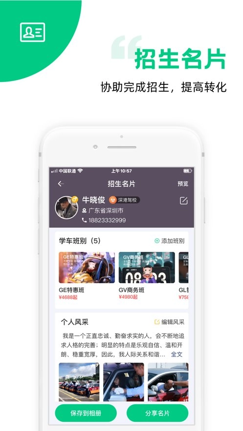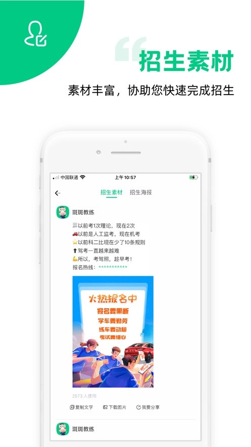 这是一款助力驾校招生的服务软件,它会记录并分析科目二、三的考试通过率,方便你查看相关数据进行复盘总结。当有新学员咨询或报名时,软件还能自动推送消息通知,让你及时掌握情况。