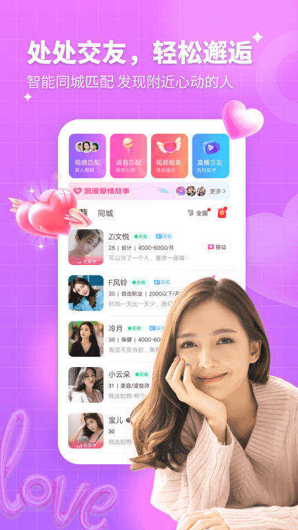 5、【同城相亲】同城附近的陌生人可以通过语音视频聊天进行交友相亲,平台会依据地理位置和兴趣爱好,智能推荐附近同城的单身异性,只需一键点击,就能速配附近好友并即刻开启聊天。无论是线上相亲交友,还是线下见面约会,同城附近的陌生人都能在这里快速脱单。
