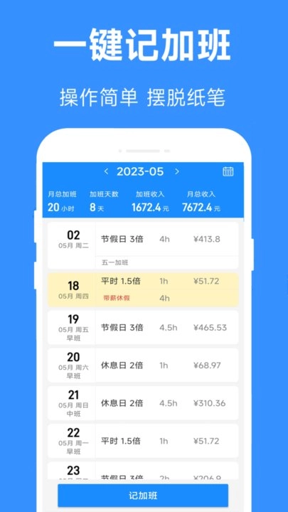 好记加班,帮您记录每日加班时长,自动核算加班薪资,让您随时记录工资、每日跟进加班情况,还能自动生成加班日历,统计工时。用这款简单易用的加班记录工具,精准记录每一刻加班时间,确保您的辛勤付出都能得到应有的回报!