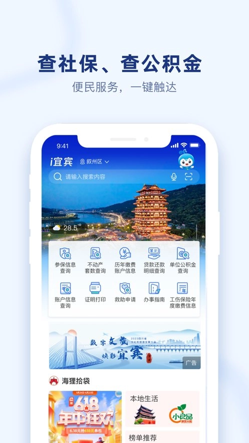 “i宜宾”是宜宾市人民政府面向市民打造的一站式城市移动综合服务平台,整合了政务、公共服务、社会服务与融媒体资讯,构建起移动端城市服务的统一入口。目前,该平台已集成社保、医保、公积金查询等政务服务,以及生活缴费、文旅出行等便民服务,并汇聚各类媒体资讯内容。依托大数据技术,“i宜宾”为市民提供个性化、精准化、智能化的服务,不断增强宜宾市民的归属感与幸福感。