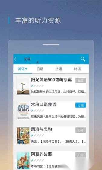 :囊括英语、日语、法语、韩语、德语、西班牙语等6大语种,近500个听力节目,互联网上最大的听力资源库;