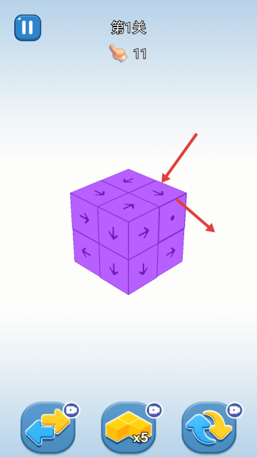 2、【第1关】要把紫色方块上的箭头消除掉,右上角能看到剩余步数是【11】,底部备有三个可以使用的道具。