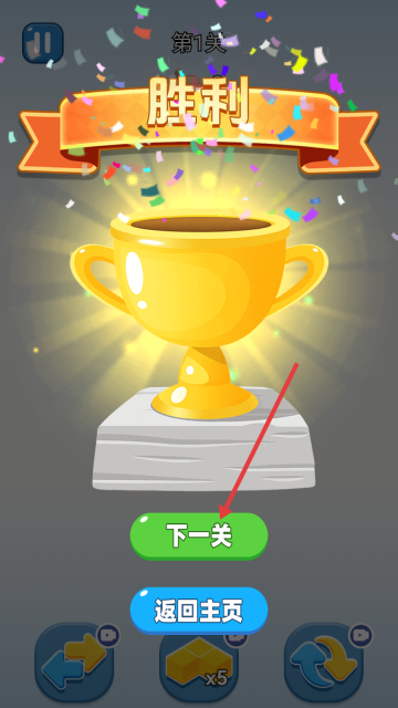 4、游戏通关后会显示【胜利】提示,此时你可以选择点击【下一关】继续挑战,也可以点击【返回主页】。