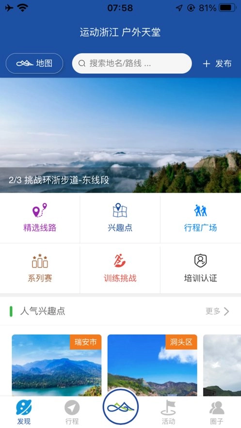 -户外旅游运动必备利器,可实现浙江省内各类景区、户外运动场地的信息查询与服务获取。
