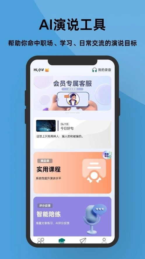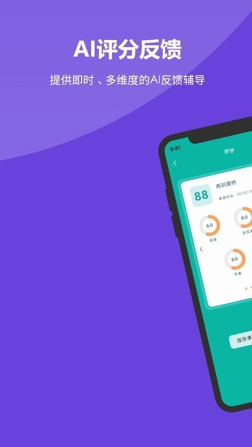 1、智能陪练功能:你只需按照要求录制并上传演讲片段,我们自主研发的模型就能对演讲进行智能评分,清晰指出优势与不足,通过机器替代人工实现即时反馈,助力你更高效地查缺补漏。
