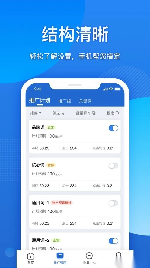 支持投放管理功能:可实时查看不同投放层级的物料详情,能随时对各层级的投放配置进行调整,比如预算、投放地域、开启/暂停状态、出价等,帮助用户更好地把控营销推广工作。