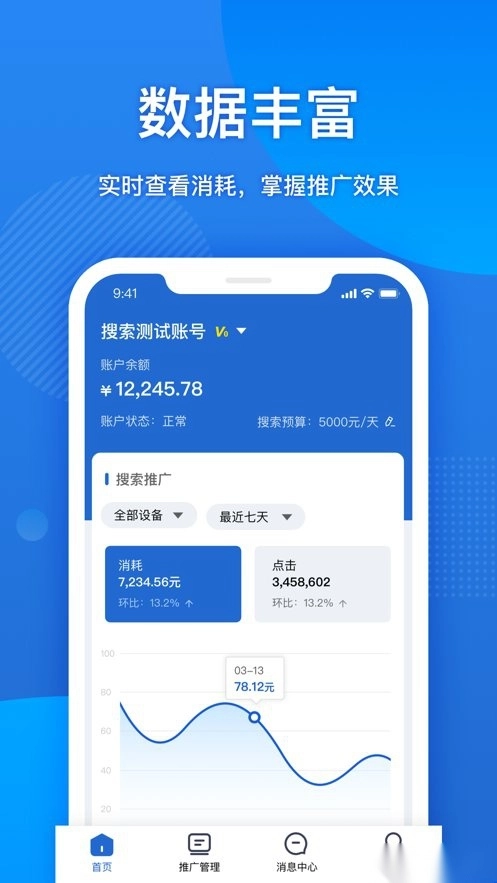 提供丰富数据支持:首页支持查看账户实时数据与历史投放数据;各管理层级均可查看物料的详细投放数据,助力您快速掌握投放效果。