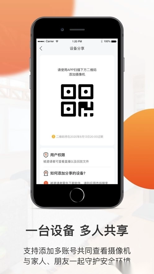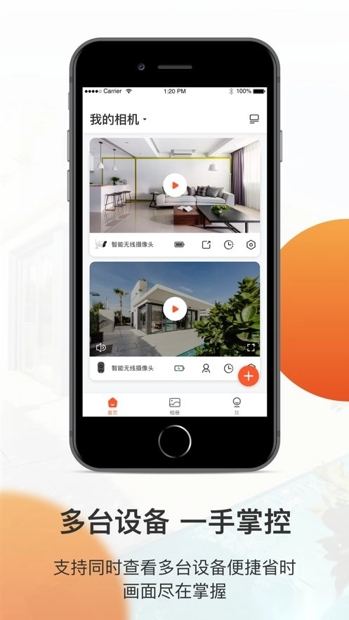 全橙看家需搭配智能摄像头产品使用,您能随时查看屋内、庭院、阳台等区域的实时画面,也可快速浏览摄像头自动监测时的录像;借助App,还能轻松实现多设备同时监控或家人共享使用。