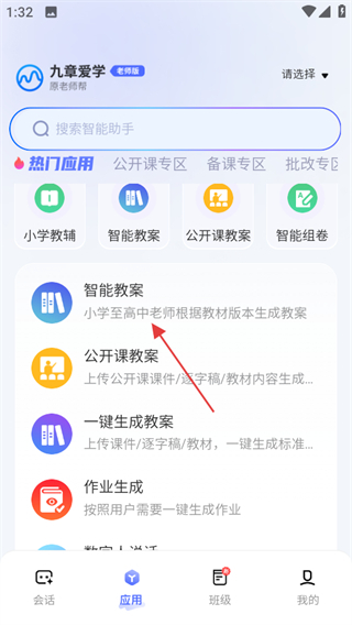 2、进入应用页面后,点击“智能教案”选项,即可进入智能教案的设置界面。