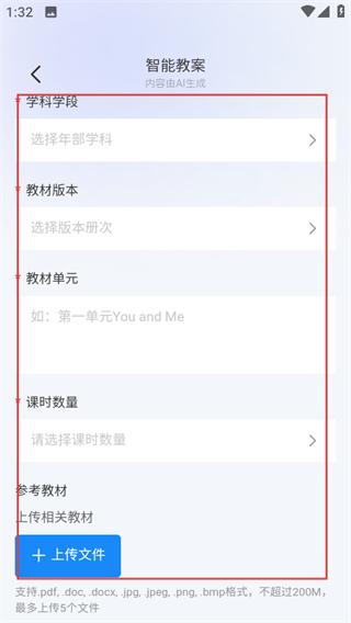 3、进入智能教案设置页面,完成信息填写并上传参考教材,系统便会生成智能教案。