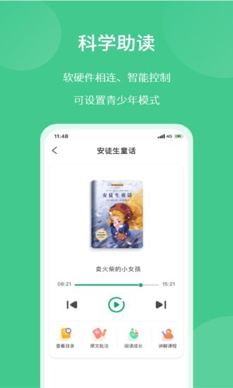 2、采用全新的形式,将“全文朗读”“快乐听读”“多元解读”“智能伴读”“亲子共读”与“科学助读”这几大模块联袂呈现。