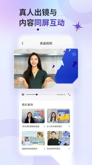 来画视频作为新一代视频演示工具,能够把真人实拍的视频和PPT演示文稿、图片、文字进行实时同屏呈现,帮助用户快速制作出互动式演示视频,让视频演讲与展示变得更加生动有趣。