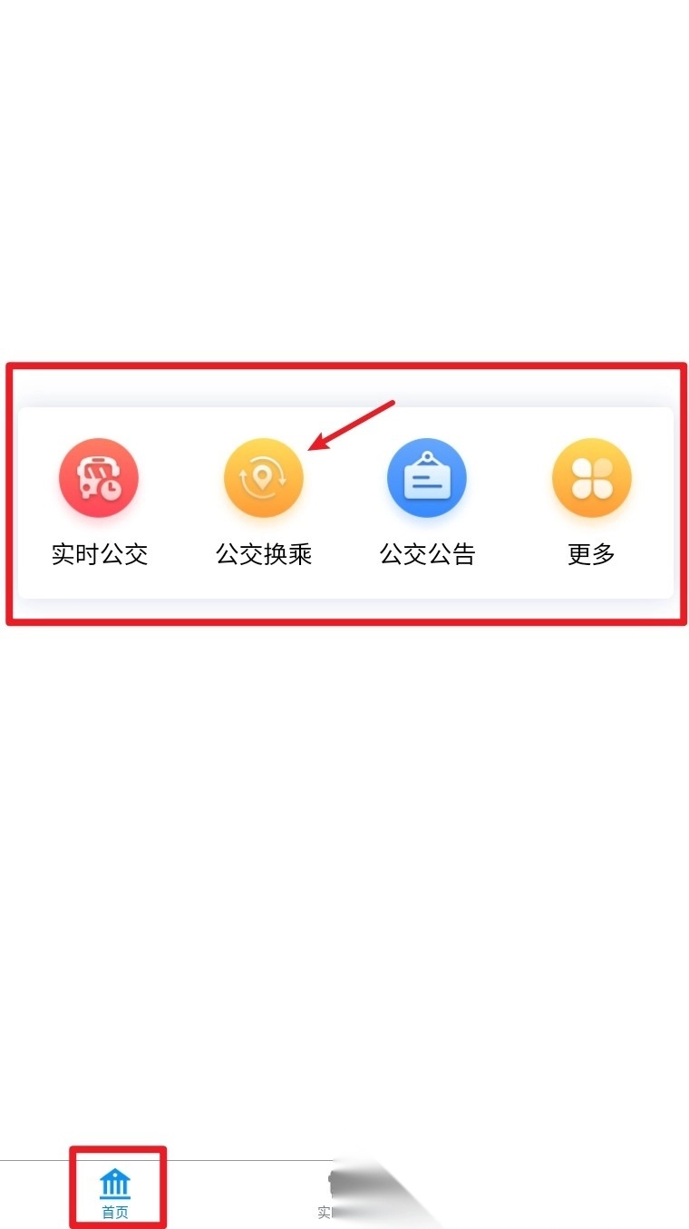 3. 返回首页后点击“公交换乘”功能,设置好起点和终点的信息,然后开始进行路线查询;