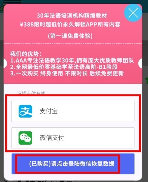 在弹出的窗口里,你可以选择【支付宝】或【微信】这两种支付方式;要是已经购买过的用户,直接点击下方的蓝色按钮恢复购买就行。完成这一步后,就能获取到对应教材的PDF文件了。