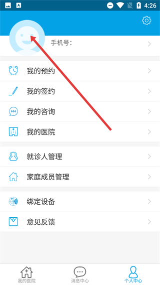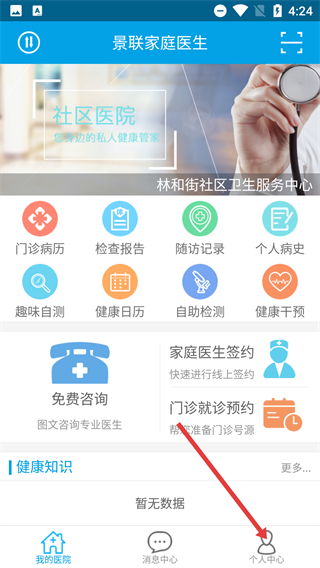 1、在景联家庭医生首页,点击页面右下角的【个人中心】按钮,即可进入个人中心页面。