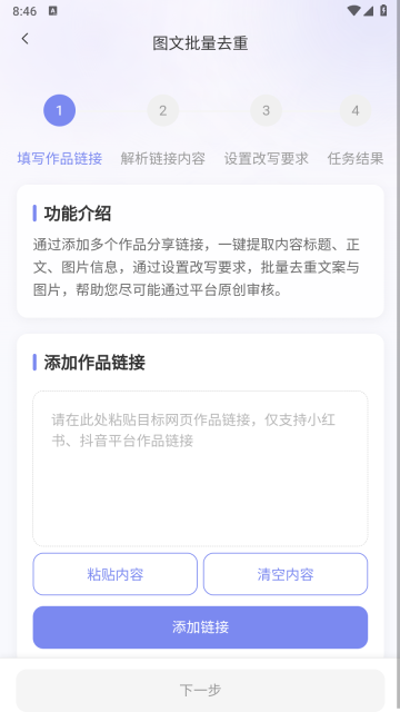 2.打开其他社交平台,复制对应作品的分享链接,随后回到App的图片批量去重页面