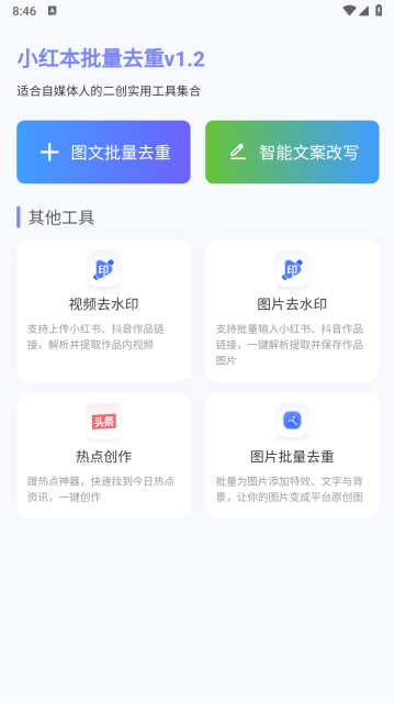 小红本批量重写App是一款功能强大的免费批量图文转文字软件,是小红书达人和抖音博主不可或缺的创作工具。它支持图文批量去重、智能文案重写、视频去水印、图片去水印、热点文章创作等实用功能,能一键快速生成爆款图文内容,助力用户轻松提升创作效率,有需要的朋友赶紧来体验吧!