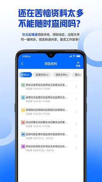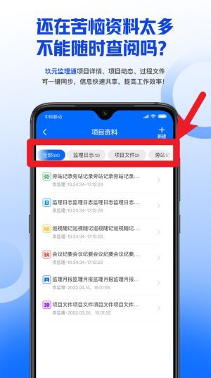 2、在项目资料页面,可快速筛选全部资料、监理日志与项目文件,达成按类型便捷查询的目的。