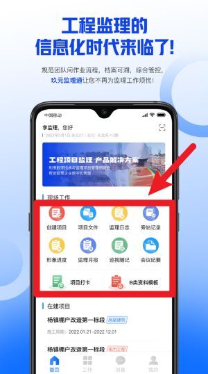 3、点击首页的现场工作区域,该区域集中展示了创建项目、文件管理、日志记录等功能,便于监理开展全过程管理。